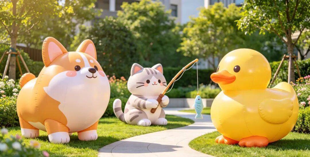 r柯基犬、钓鱼猫、小黄鸭……超萌气模装置散落园区。