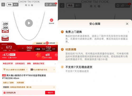 京东特别推出“材质保障”服务,带来更安心的铂金购物体验。消费者购买标有“材质保障”标识的铂金饰品后,若对材质存疑,可申请按相关国家标准检测,如结果与商品描述不符,京东将提供退1赔3补偿。大家可以打开京东APP搜索“铂金金条“”铂金项链“,选购更丰富的产品,体验更实惠的价格和更优质的服务。