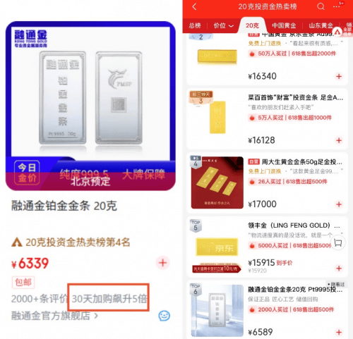 6月18日,现货铂金收盘价报每盎司1332.28美元,创十年以来新高,年内涨幅已突破45%,折射出消费者高涨的投资热情。京东618期间,铂金金条成交额同比增长超17倍,其中融通金20克铂金金条广受欢迎,近一月来加购人数飙升5倍,跻身京东20克投资金热卖榜,与中国黄金京东“狗头金”、周大生黄金金条等热门产品共同位居榜单前列。